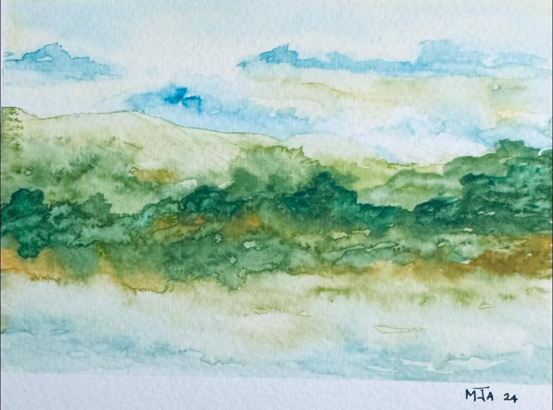While flying over the vast Syrian desert, I pulled out my watercolors to capture the breathtaking view outside. The sky stretched endlessly, presenting a brilliant blue canvas adorned with wispy clouds. Below, green bushes dotted the arid terrain, and in the distance, faint hills glimmered under the sun, with hints of shimmering water resembling an oasis on a scorching day.